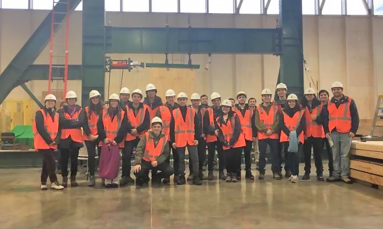 Estudiantes de la Facultad de Arquitectura, Construcción y Medioambiente de la Universidad Autónoma de Temuco. Acompañados del Docente Martín Hurtado, quién también realizó la arquitectura del Laboratorio de Madera Estructural.